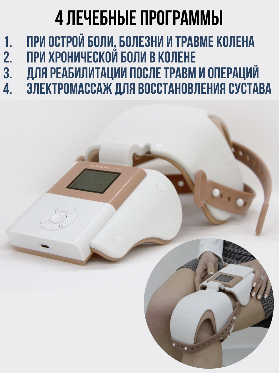 Безопасность и эргономика: Прибор имеет эргономичный дизайн, универсальный размер и работает от литий-ионного аккумулятора. Просто выберите программу, зафиксируйте электроды вокруг колена — и начните сеанс комфортного и эффективного лечения.