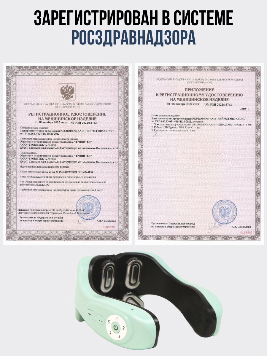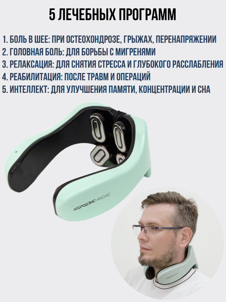 НЕЙРОДЭНС-АКСИС: Ваш персональный физиотерапевт для шеи, плеч и ясности ума! Забудьте о скованности, боли и тумане в голове. НЕЙРОДЭНС-АКСИС — это не просто массажёр, а интеллектуальная система для комплексного оздоровления шейно-воротниковой зоны, созданная на основе передовой технологии динамической электронейростимуляции (ДЭНС). Она решает не только симптомы, но и причины проблем, возвращая вам лёгкость движений и ясность мышления.