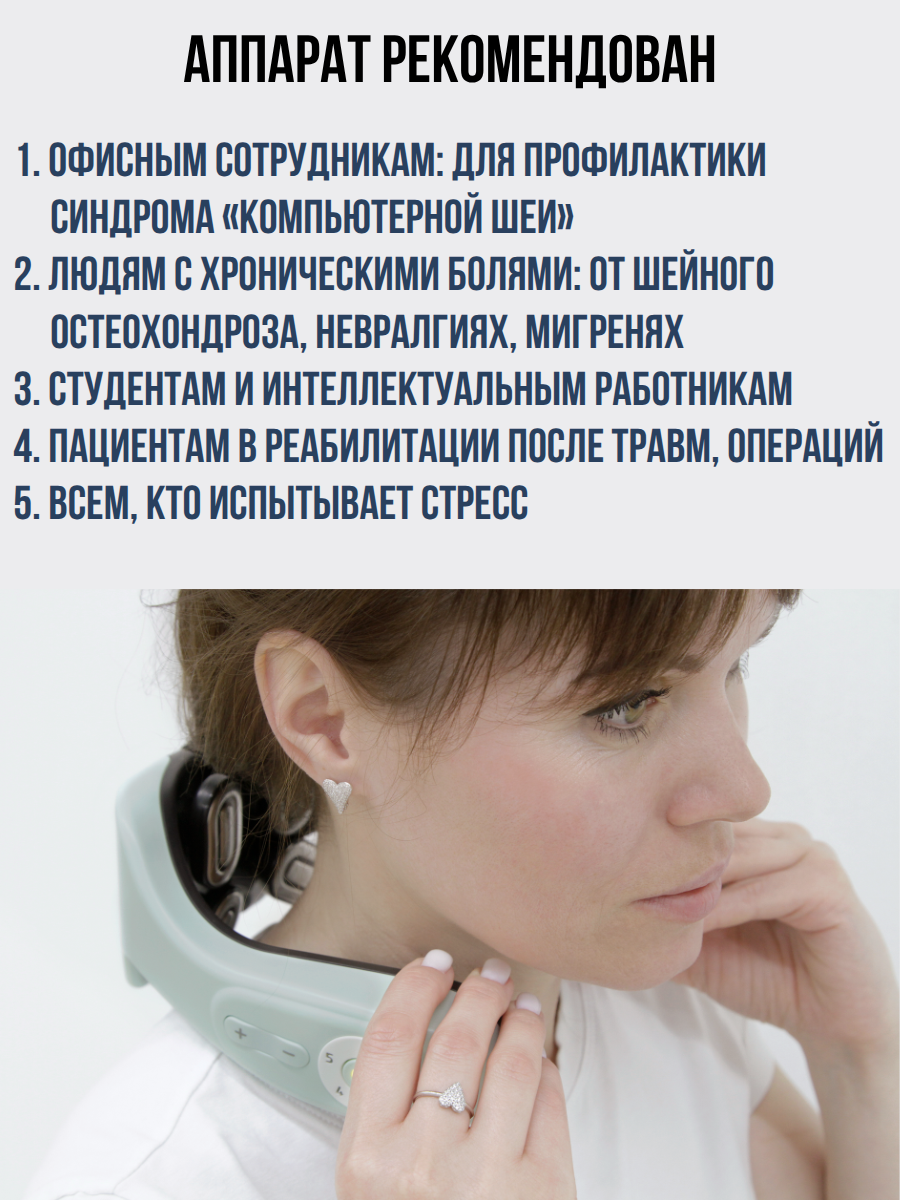 Максимальный комфорт и безопасность: Конструкция идеально повторяет анатомию шеи, обеспечивая полный охват проблемной зоны. Беспроводной дизайн и интеллектуальные алгоритмы делают процедуру приятной, безопасной и эффективной даже в домашних условиях.