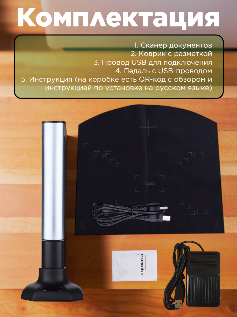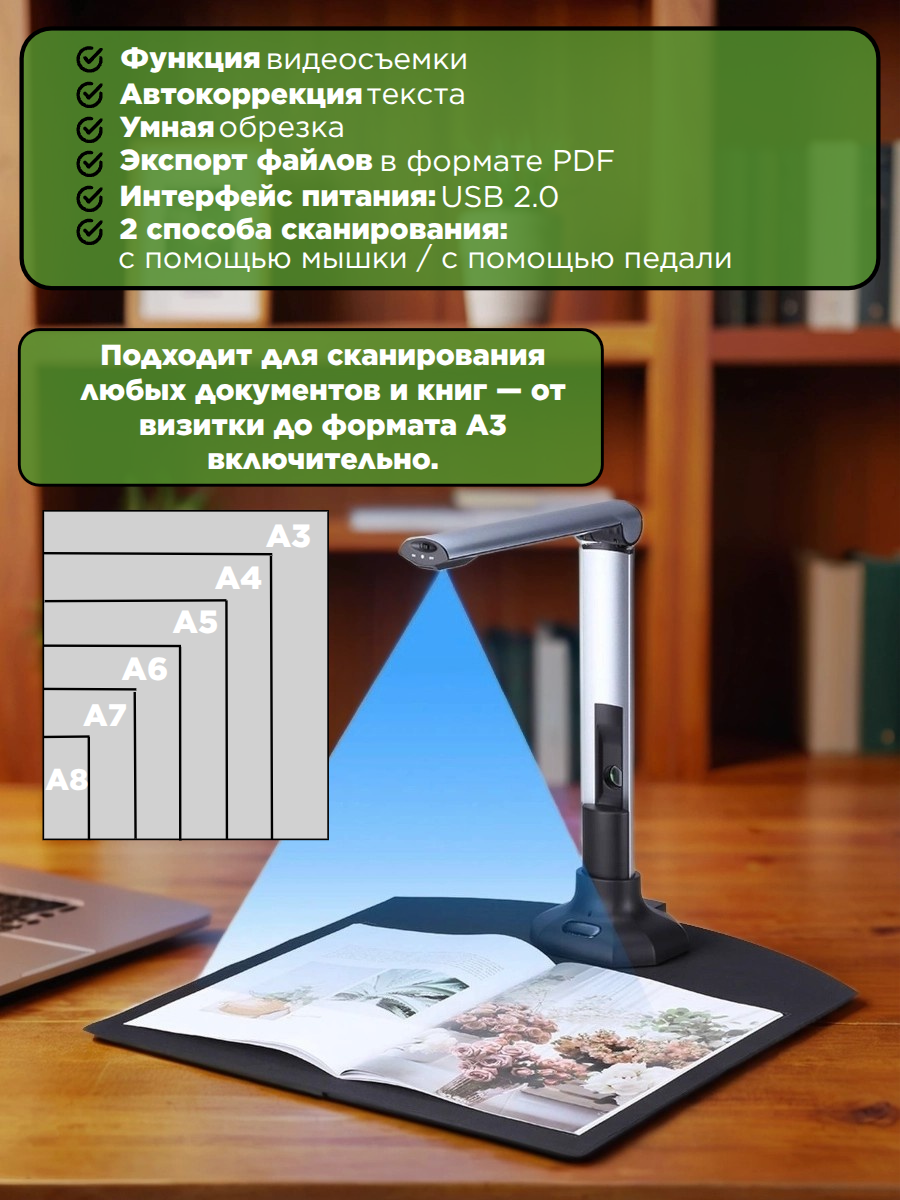 - В комплекте идет ножная педаль. Нажмите ногой — и камера сделала снимок. Руки остаются свободными для перелистывания книг или документов.